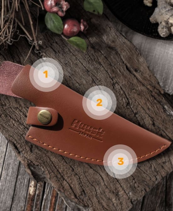 Naše tokove smo zasnovali z mislijo na dodatno zaščito. Z uporabo debelega, podloženega usnja smo zagotovili, da bodo vaši noži Huusk varni pred lomljenjem in poškodbami ne glede na to, kam jih boste vzeli s seboj.